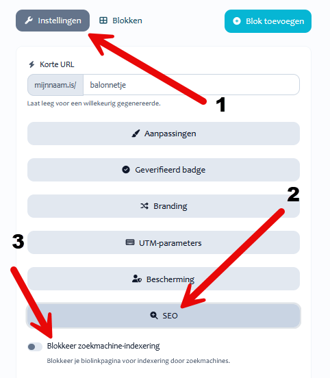 < Alle onderwerpen Hoofd Voor een goede start Zichtbaarheid in Google Wil je niet dat jouw domeinnaam/Biolink wordt gevonden? Volg onderstaande stappen.